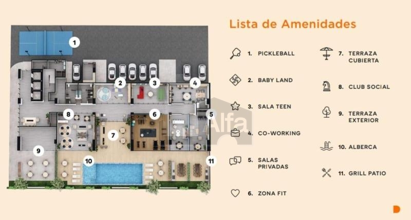 El edificio cuenta con excelentes amenidades, diseñadas para brindar comodidad y un estilo de vida completo: alberca, área de asadores (Grillpatio), terraza, gimnasio equipado (Fitzone), salas privadas, club social, espacios de co-working, sala teen, área infantil (Baby Land) y cancha de pickleball.