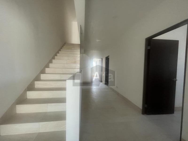 Recibidor de doble altura, medio baño, cocina integral con cubierta de granito, tarja y parrilla; área de sala–comedor, sink de limpieza, bodega interior, cochera para dos autos, bodega exterior con sink y jardín posterior con llaves de agua.