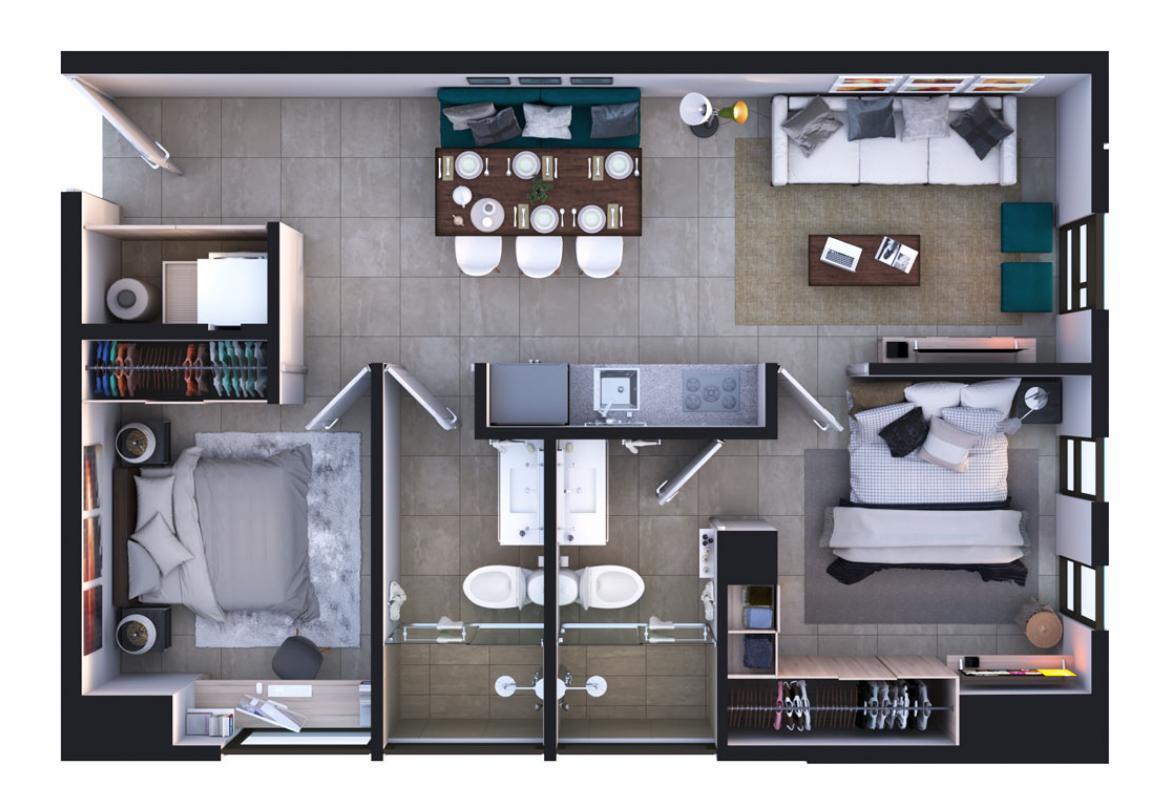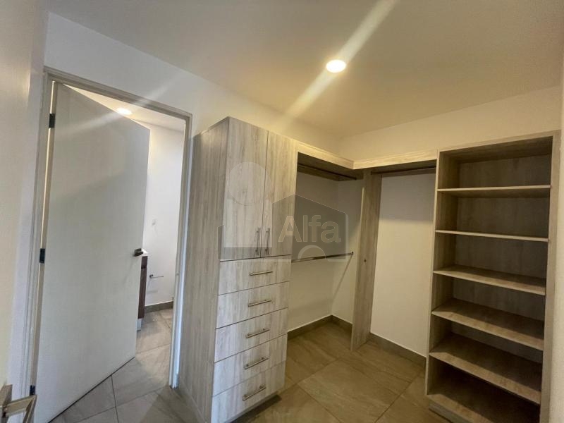 El departamento cuenta con dos amplias habitaciones, dos baños completos, walk-in closet, cocina totalmente equipada y dos cajones de estacionamiento.