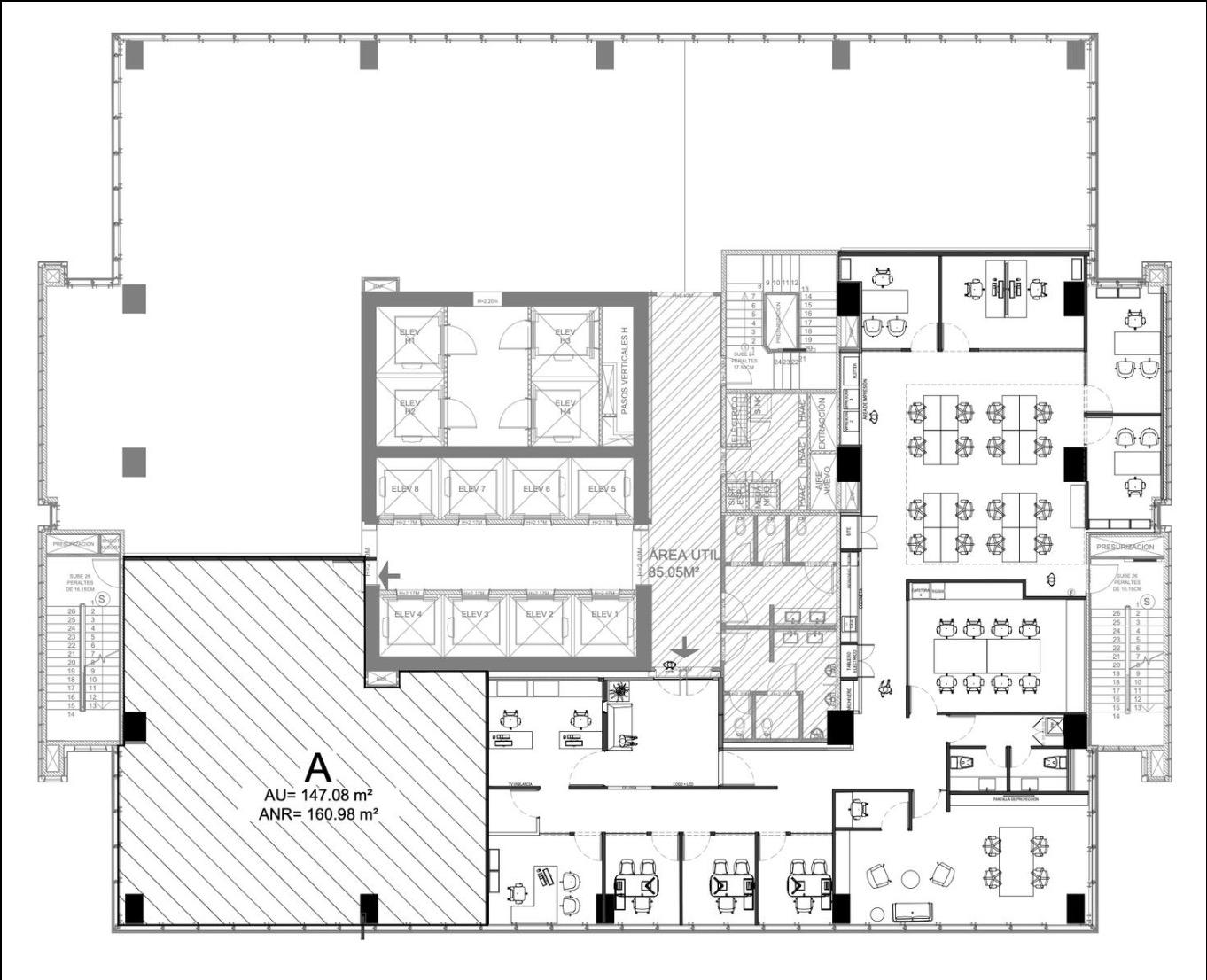 Planta tipo: 984 m2. 15 niveles de oficinas, hotel y locales comerciales.