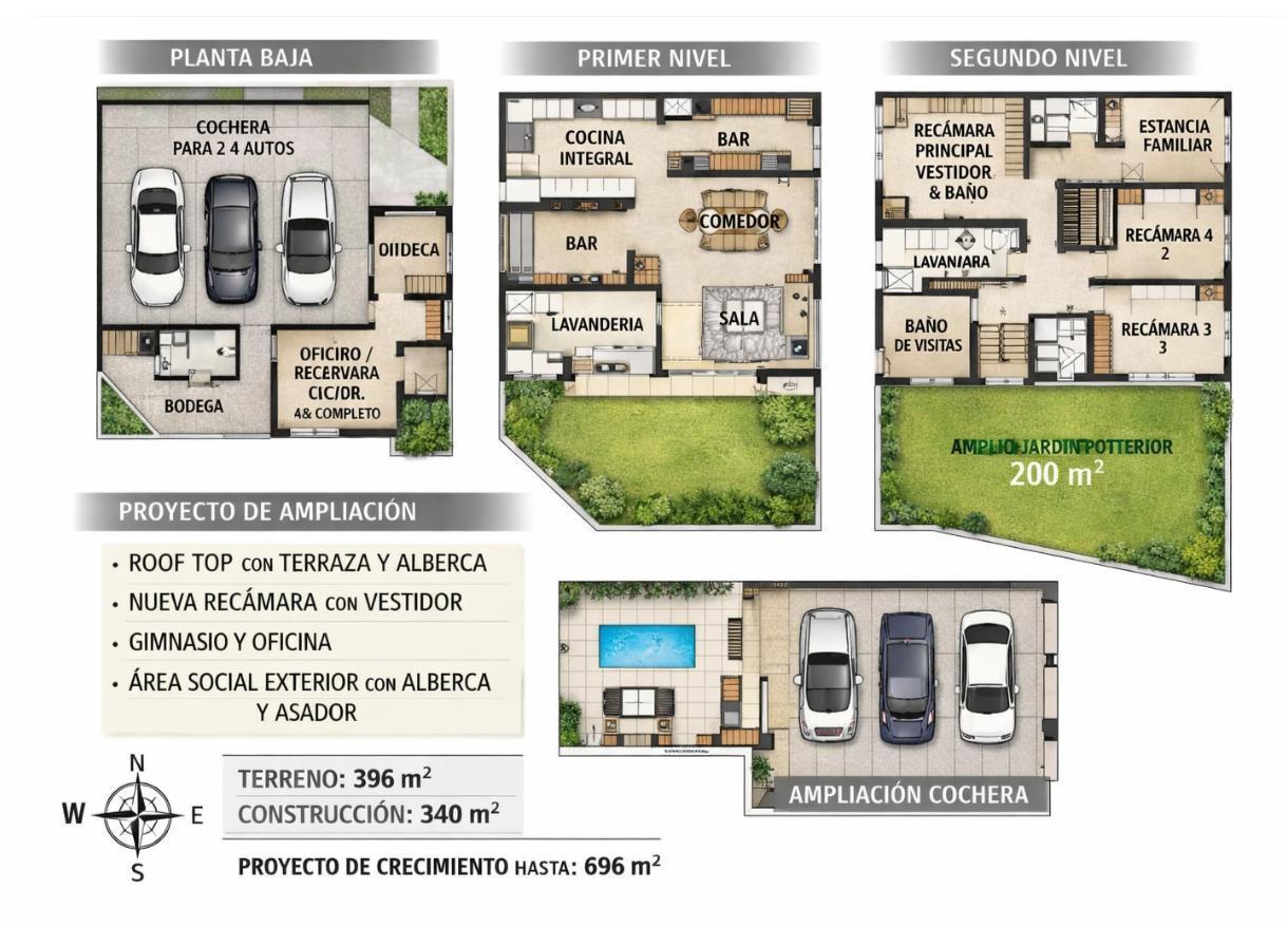 Este proyecto contempla: roof top con terraza, alberca infinita y asador; cuarta recámara con baño y vestidor; ampliación de recámara principal con balcón; gimnasio, oficina adicional y segunda lavandería. En planta baja se proyecta recámara de visitas, cuarto de juegos o cine, así como una completa área social exterior con alberca, asador, baños y cuarto de máquinas, además de ampliar la cochera a 4 autos.