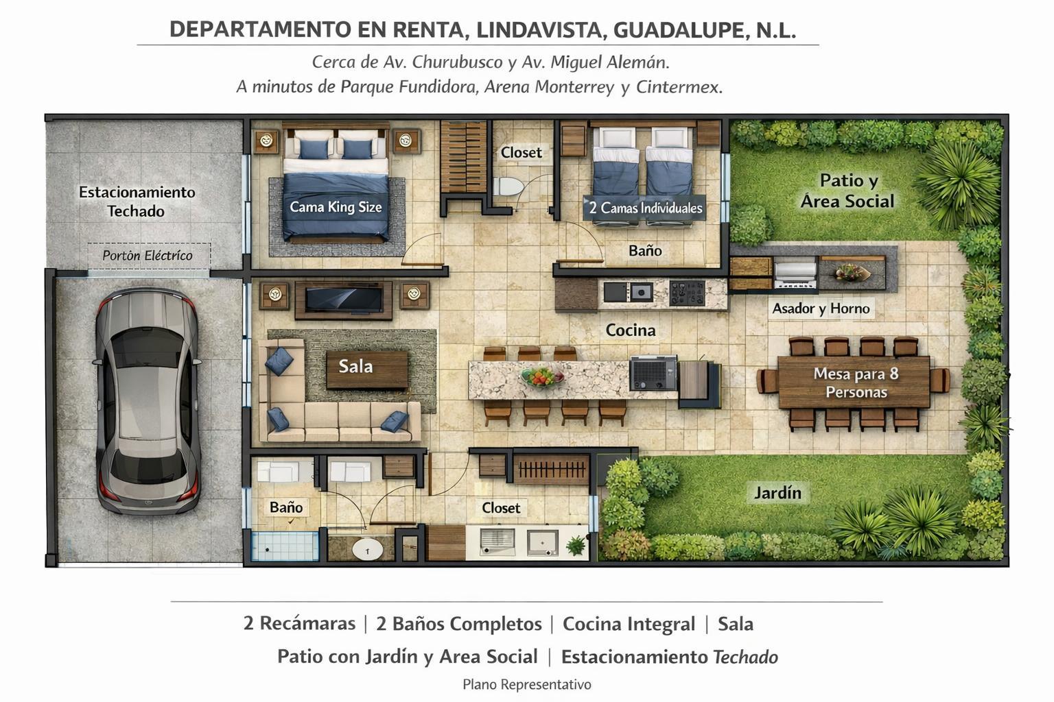 Departamento en renta en Lindavista, Guadalupe, Nuevo León, con ubicación privilegiada cerca de Av. Churubusco y Av. Miguel Alemán, una de las zonas con mayor conectividad de la ciudad. A pocos minutos de Parque Fundidora, Arena Monterrey y Cintermex, así como de importantes centros comerciales, restaurantes, supermercados y servicios, lo que lo convierte en una excelente opción para vivir con comodidad y cercanía a todo.